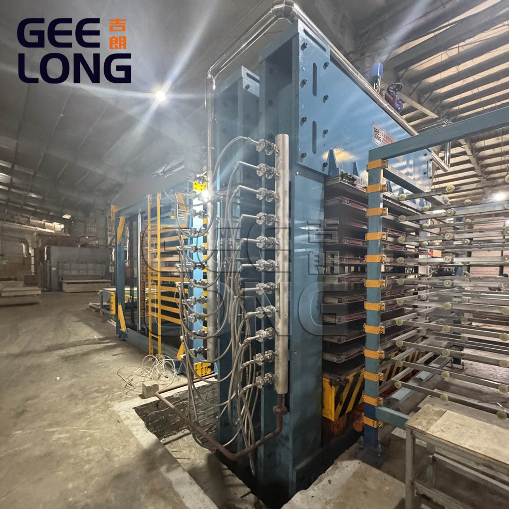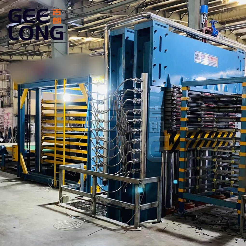 this machine we installed in the vietnam, consist of the pre-paving conveyor, 10 spans plywood hot press machine, air cleaning device for each layer, 1200T plywood hot press machine with ss plate and buffering cushion pad, board automatic pusher, cooling rack, and E lifter machine for stacking the ready film faced plywood, this is not only GEELONG can do, we can do more automatic for this line, specially designed for Europe market, less labors, more automatic.